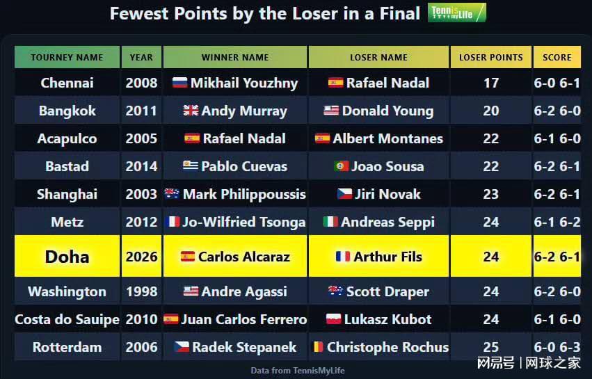 那么,自1990年ATP巡回赛建立以来,亚军决赛总得分最少的排名榜上,菲斯的24分能排到第几位呢?让我们看看历史榜单: